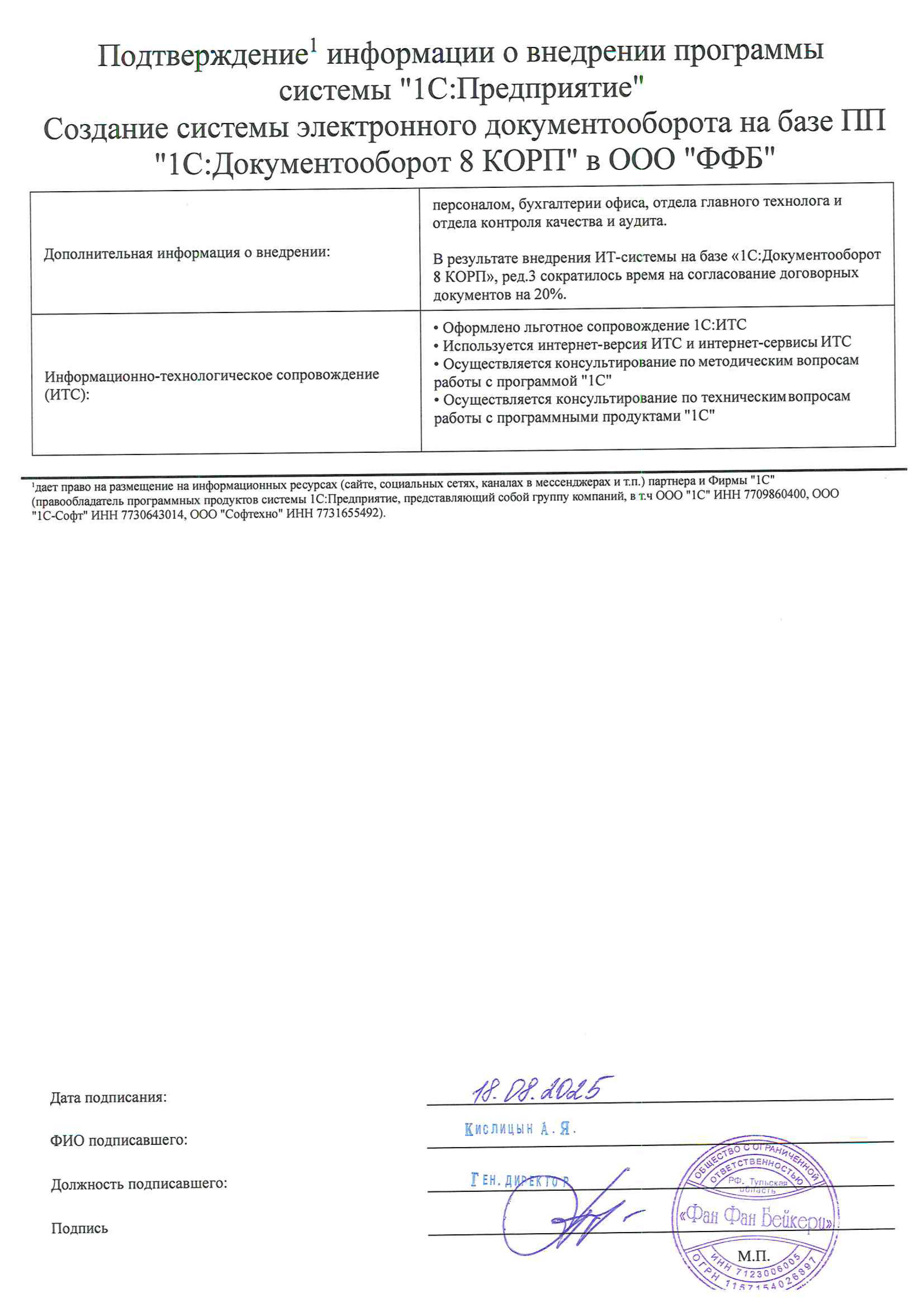 В качестве компании-интегратора приглашен «1С-Рарус», имеющий большой опыт автоматизации учета на базе программных продуктов «1С:Предприятие 8». Интегратор сертифицирован по системе менеджмента качества ISO 9001:2015, имеет статус Центра компетенции по документообороту фирмы «1С».