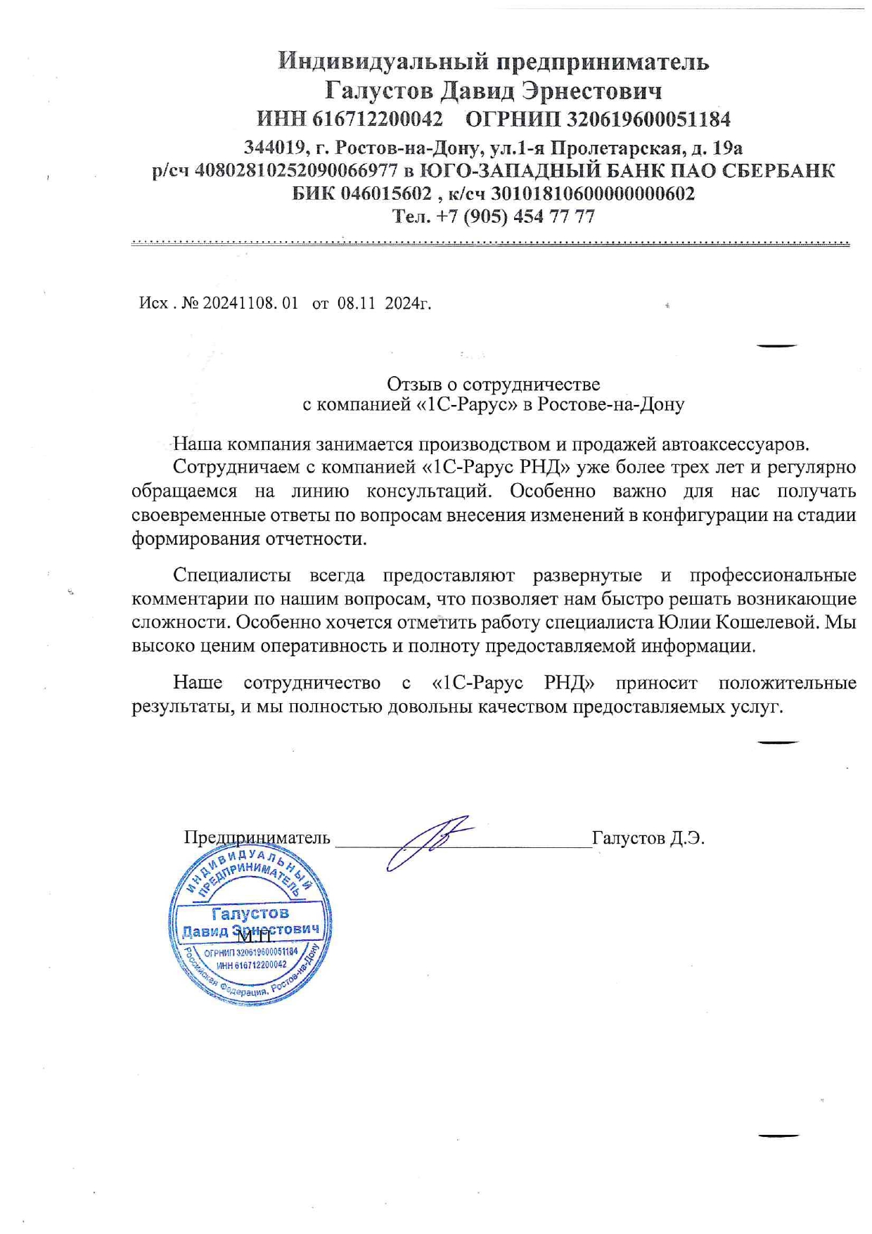 Сотрудничество с «1С-Рарус РНД» приносит положительные результаты, и мы полностью довольны качеством предоставляемых услуг.