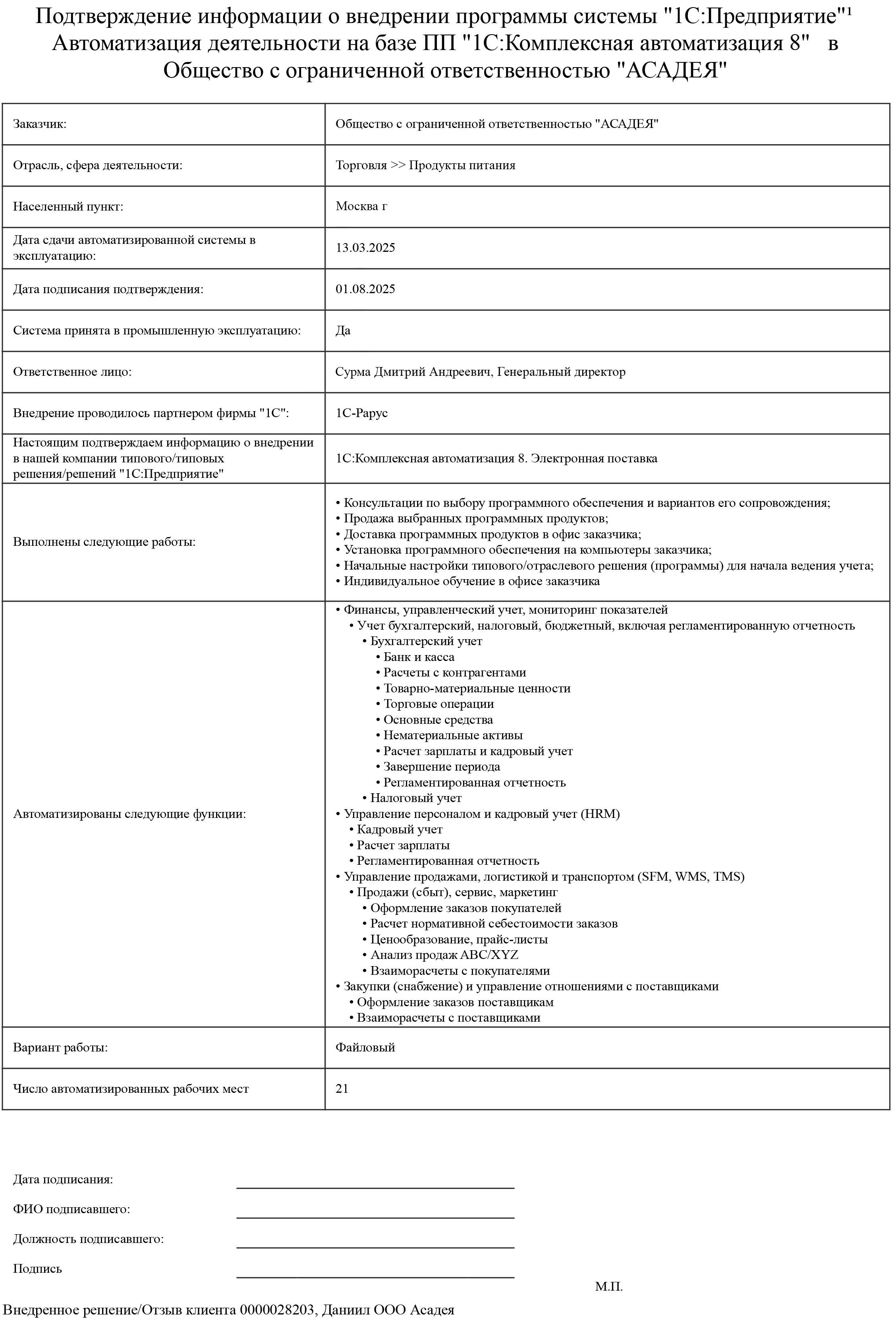 Мы обратились в компанию Общество с ограниченной ответственностью «1С-РАРУС» за выполнением работ по автоматизации деятельности на платформе «1С:Предприятие 8».