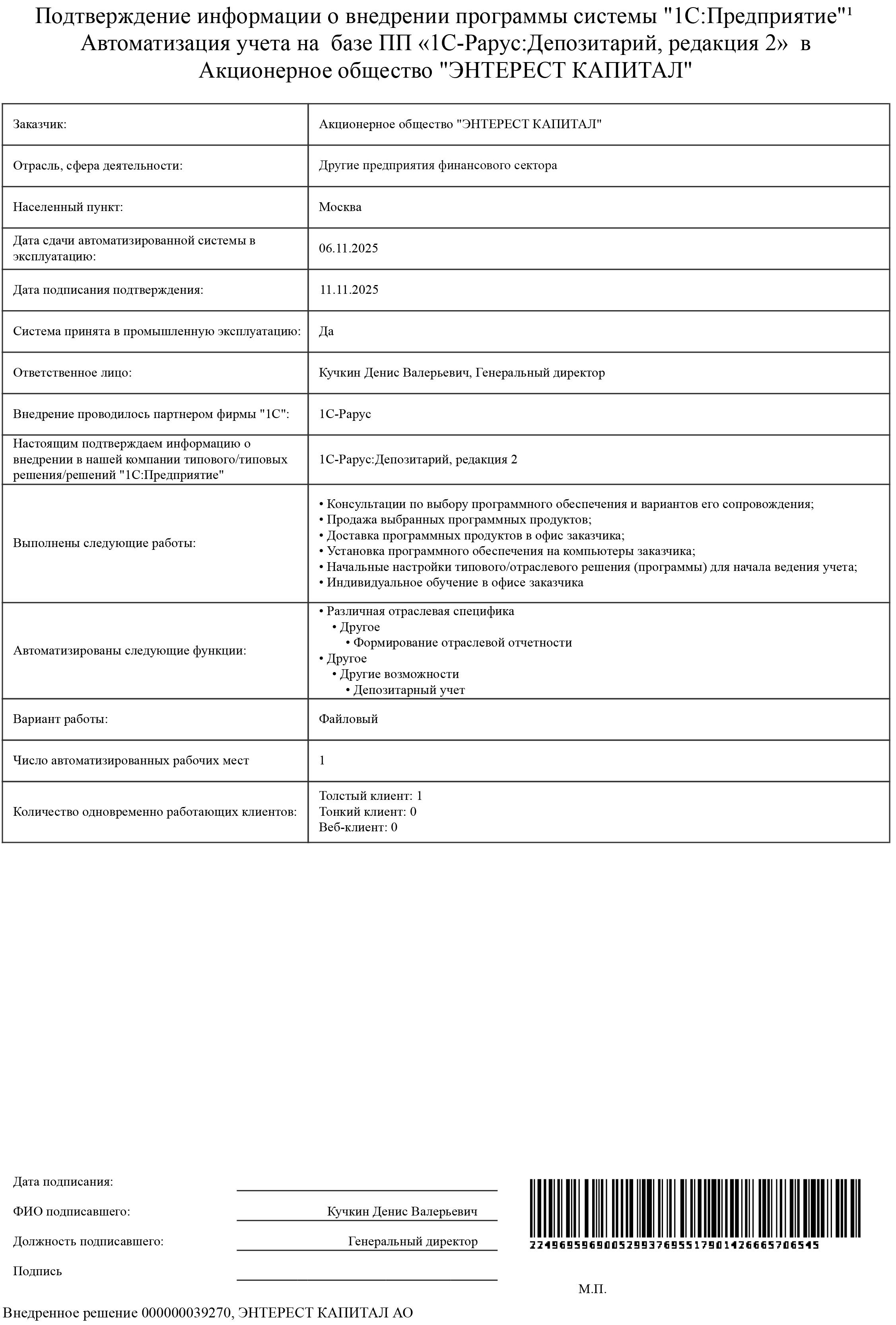 Наша организация принял(а) решение об использовании программного продукта «1С-Рарус:Депозитарий, редакция 2» в целях автоматизированного ведения учета по стандартам российского законодательства.