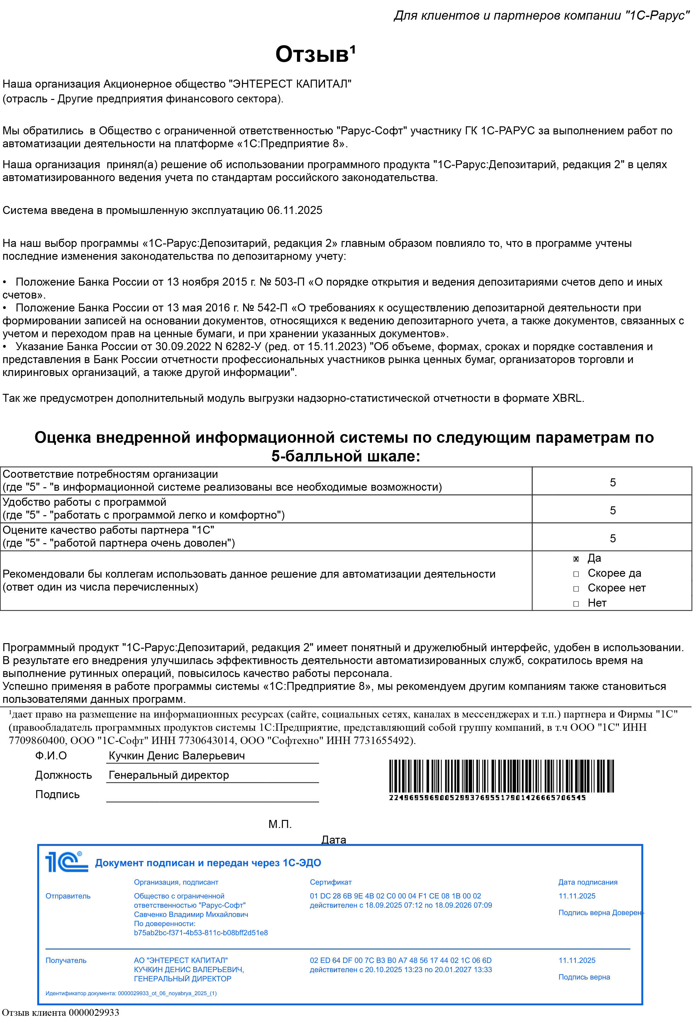 Программный продукт «1С-Рарус:Депозитарий, редакция 2» имеет понятный и дружелюбный интерфейс, удобен в использовании. В результате его внедрения улучшилась эффективность деятельности автоматизированных служб, сократилось время на выполнение рутинных операций, повысилось качество работы персонала.